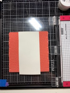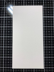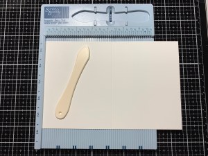 I now place a 5 1/2″ x 8 1/2″ piece of White Cardstock into my Scor Buddy and score it at 4 1/4″ creating a side folding card base. To add some dimension to my panel before mounting it to the card base, I adhere a 2 1/2″ x 5 1/2″ piece of Fun Foam to the back using Liquid Glue then mount it to the card base so that there is equal white space on either side.