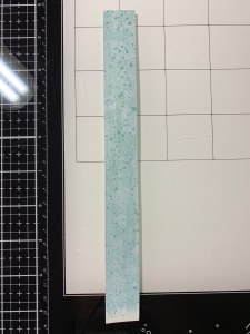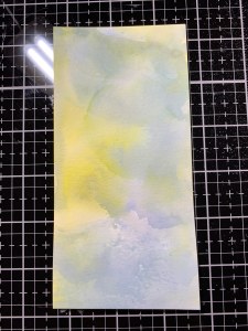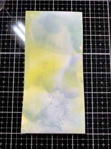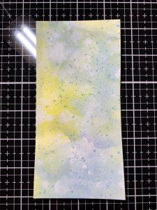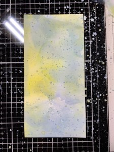 To start I cut a 3″ x 5 1/2″ panel out of Watercolor Cardstock using my Guillotine Paper Trimmer. To give a watercolored look to my panel I start by pressing my ink pads onto the white area of my Glass Mat… Speckled Egg Distress Oxide Ink, Stormy Sky Distress Oxide Ink, Shabby Shutters Distress Oxide Ink, and Weathered Wood Distress Oxide Ink then spray the ink with water using my Distress Sprayer.