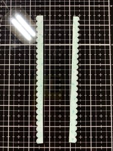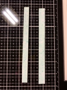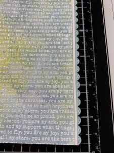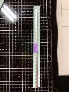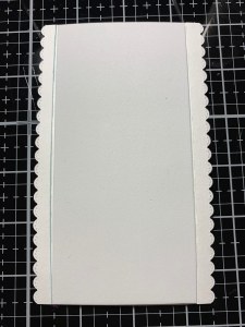 Using the smallest die from the Stitched Scalloped Borders Die Set I adhere it down to the center of my first strip then run them through my Big Shot Die Cut Machine and repeat for the second strip. I now have a decorative strip for each side of my panel. Using Liquid Glue I attach both strips to my panel then trim off the overhang.