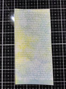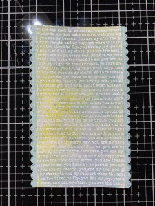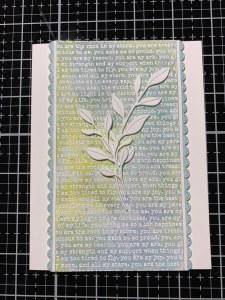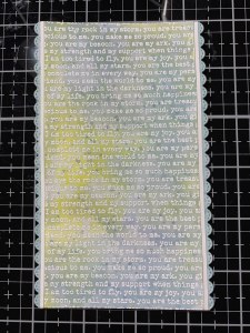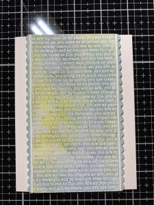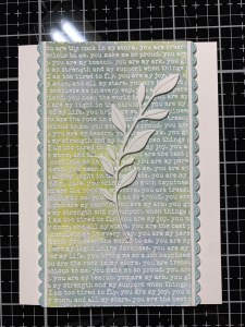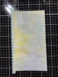 Next, I place my You Are Background Stamp on the door of my MISTI Stamp Positioner then add a little Adhesive Dot Runner to the back of my blended panel. I then line up my panel face down over the stamp and close the base of the MISTI onto the door then flip it over. My panel is now attached to the base of the platform and perfectly lined up. (Sorry I didn’t get a photo!) I prep the panel with my Anti Static Powder Tool then use Versamark Ink to stamp my image. I add White Embossing Powder then heat set with my Heat Tool.