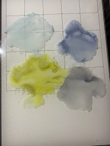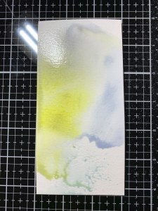 Taking my panel I place the textured side down and drag it through the ink. I then use my Heat It Tool to dry the panel. I repeat this process a few times until I am happy with the look of the panel. *You could also press the ink onto a silicone mat so that the color would bead up which would create droplets of ink onto the panel. However, I was going for more of a clean watercolored look.