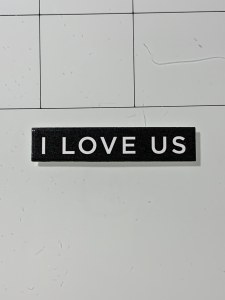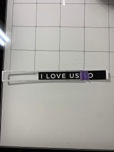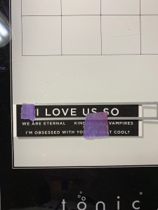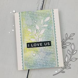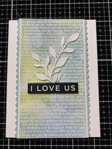 I now choose a preprinted sentiment from the Reverse Sentiment Strips Love. I use one of my Sentiment Labels Die to cut out the strip, running them through my Big Shot. I want to shorten the sentiment a bit and only want the words “I love us” so I line up the same die to cut off the word “so” then run them through my Big Shot. *Did you know that these sentiment strips are printed with toner ink and can be foiled!!!? They are also available with black print on white background and can also be foiled.