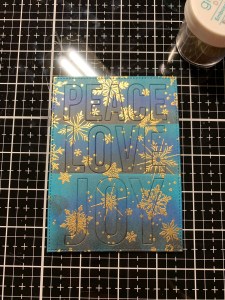 After the blended ink is completely dry, I leave the Post It Tape still intact on the back of my panel (so that the letters don’t move) and place the panel into my MISTI Stamp Positioner then prep it with my Anti Static Embossing Pad. I then place the Delicate Snowflake Background Stamp over the panel and pick it up with the door of my MISTI. Next, I ink up the stamp with Versamark Ink then stamp it onto my panel. I then remove the panel and add Gold Embossing Powder and heat set with my Heat Tool.