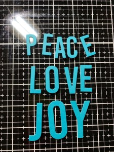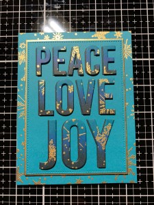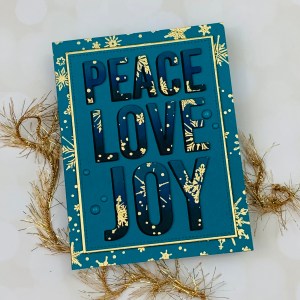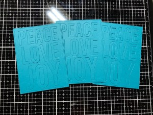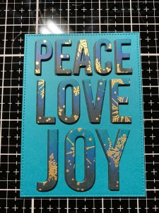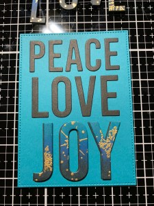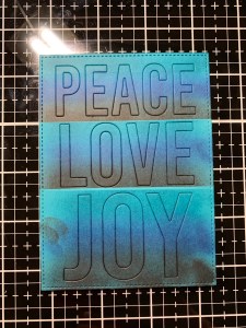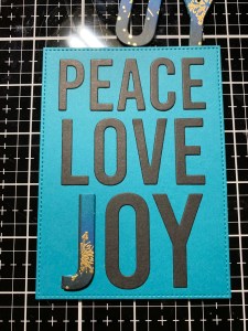 To add some dimension to my letters, I use the same Peace Love Joy Die Plate and cut out of Tranquil Teal Cardstock three times, running them through my Big Shot. I remove all of the letters from the panels then use Liquid Glue to stack and glue each letter die cut together. I then remove all of the ink blended die cut letters from my blended panel and glue them to each stacked die cut, using Liquid Glue.