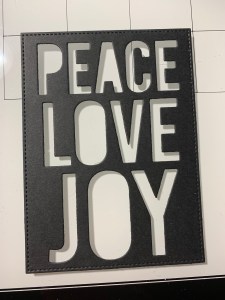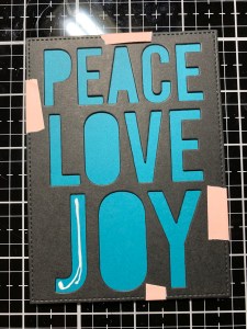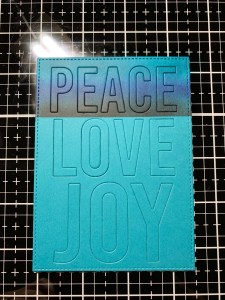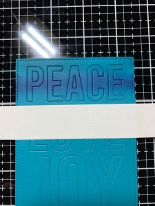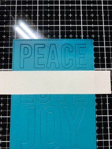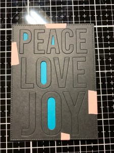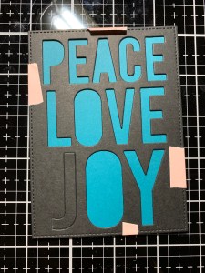 To start, I take the Peace Love Joy Die Plate and cut out of a 4 1/4″ x 5 1/2″ panel of Tranquil Teal Cardstock, running them through my Big Shot Die Cutting Machine. To keep the letters all intact while I do my ink blending, I place strips of Post It Tape over the back of the panel. I then take a piece of Post It Tape and place it just under the first word “peace” to avoid getting any ink onto the word below when I do my ink blending.