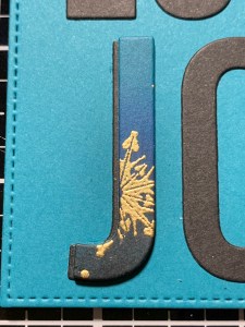 I now place the black template over the teal panel and hold them together using some washi tape. Starting with the “J” I add some Liquid Glue then inlay the black die cut into the opening. I continue adding Liquid Glue into each of the letter openings and inlay the die cut letters until the panel is complete then carefully remove the black die cut panel. *Using the die cut panel as a guide ensures proper placement of each letter and gets everything lined up perfectly!