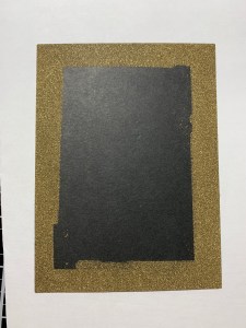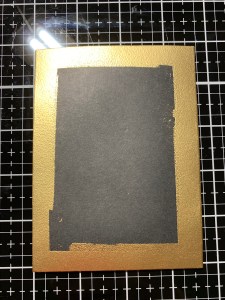 Next, I create a mat for my panel. Taking the largest die from the Master Layouts 2 Die Set I cut out of Black Onyx Cardstock, running them through my Big Shot. Using the edge of my Versamark Ink Pad I apply ink to all four edges of the panel. I then add Gold Embossing Powder and heat set with my Heat Tool then set the panel aside while I work on my card base.