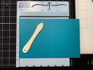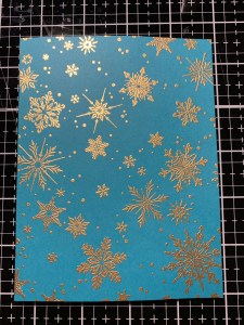 I place a 5 1/2″ x 8 1/2″ piece of Tranquil Teal Cardstock into my Scor Buddy and score it at 4 1/4″ creating a side folding card base. To add some texture and shine to the card base I place it into my MISTI and place a half sheet of scrap copy paper inside the fold to protect the rest of the card base. I then prep the front of the card base with my Anti Static Powder Pad and ink up the Delicate Snowflake Background Stamp with Versamark Ink and stamp it onto the card base. I remove the card base and add Gold Embossing Powder then heat set with my Heat Tool.
