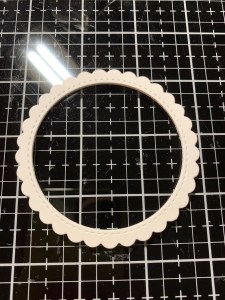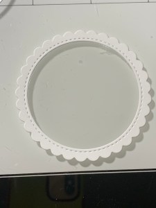 Going back to my stamped image, I add Double Sided Adhesive Tape to the back of it and adhere it onto my panel. To work on the shaker element for my image I take the smaller die from the Stitched Scallop Circle Die Set and cut out of White Cardstock five times, running them through my Big Shot. I then stack and glue four of the die cut pieces together using Liquid Glue, saving the fifth die cut piece for the next step.