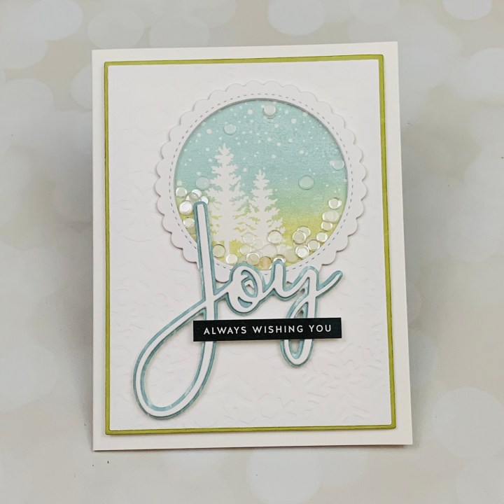 Today I have a card using some products from Simon Says Stamp’s newest release!! I was excited to play with my purchases and ended up using four of the new products on this card! I went with a clean look for my card and wanted lots of white space with some soft, subtle colors. The stamp set I used for my shaker window includes four stamps, three being scenes and one with words. Each stamp has a decorative ring that is removeable and can be interchangeable with the others. *I did not use the decorative ring on today’s card. The stamps set is red rubber, which I love as it gives such a nice solid stamped image! To add some texture on my background I dry embossed it using a stencil, so fun! Seeing there is no coordinating cardstock for distress ink, I used the directed to paper technique to create colored cardstock for the layering pieces to match my stamped image and really loved the results! All of the products I use on today’s card can be found at Simon Says Stamp. Let’s get started!!