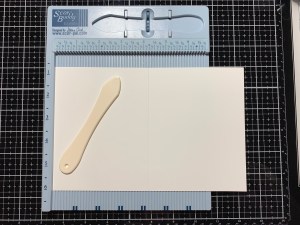 I now place a 5 1/2″ x 8 1/2 piece of White Cardstock into my Scor Buddy and score it at 4 1/4″ creating a side folding card base. To add some dimension to my panel I add a piece of Fun Foam to the back using Liquid Glue then glue it onto the card base.