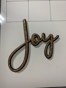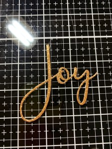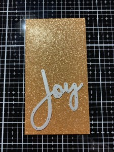 I like adding a little dimension to my die cut words, to do this I use the word die from the Large Joy Dies and cut out of Black Cardstock four times, running them through my Big Shot. I stack and glue two of the die cuts together using Liquid Glue then glue the glitter die cut on top. I then adhere this stacked die cut onto my previously cut shadow die cut using Liquid Glue.
