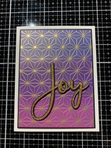Instead of adhering my greeting flat against the background, I add a little lift to it by stacking and gluing the remaining two die cut words from the Large Joy Dies to the back of the greeting using Liquid Glue. I then mount the greeting towards the lower portion of my card front, off center using Liquid Glue.