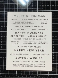 To finish off my card I choose a sentiment from the Reverse Sentiment Strips Holiday Wishes and trim it down to a thin strip using my Guillotine Paper Trimmer. For added dimension I glue two thin cardstock strips to the back of my sentiment using Liquid Glue then mount it over the greeting. Using my Jewel Picker I add some Clear Round Drops with Liquid Glue and this completes my card.