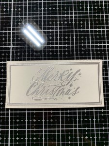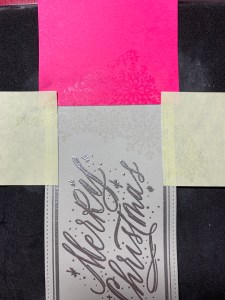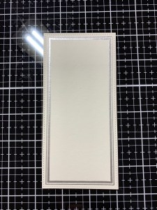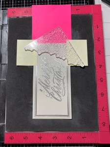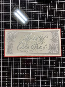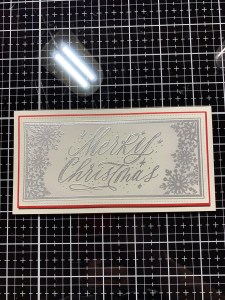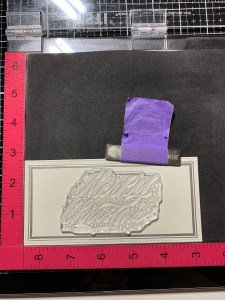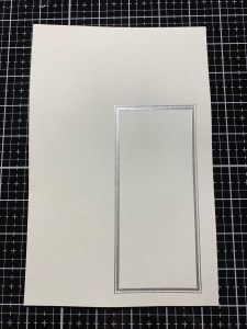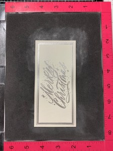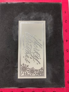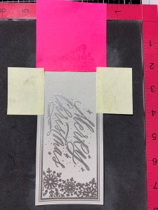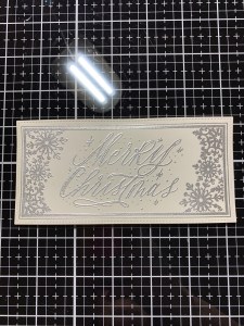 You can see in the first photo the outline of where my panel was previously placed. Now, I turn the panel around to the other end and place it over the outline. I again place the post it notes around the three sides just covering the embossed lines then ink up my stamp with Versamark Ink and stamp it onto the panel. I remove the post it notes and add Silver Embossing Powder then heat set with my Heat Tool.