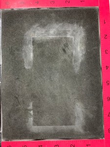 Now it’s time to stamp the sides of my panel. I add a small amount of Adhesive Dot Runner to the back of the panel then place it into the center of my MISTI, pressing down to temporarily adhere it onto the mat. I then prep the top and bottom of the panel with my Anti Static Powder Bag. I also tap the bag of powder around both ends onto the black mat a bit as this will help to create a powder frame for me to line the panel back up when I stamp the other end.