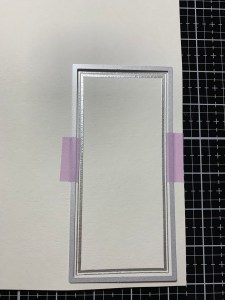 Taking the large stitched die from the Master Layouts 7 Die Set, I line it up around my embossed image and hold it into place using Easy See Tape and run them through my Big Shot Die Cut Machine. I now have a die cut panel with an even embossed frame that fits just inside the stitched edges.