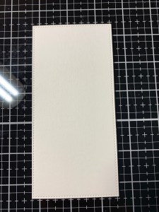 Next, I place a 6 1/4″ x 6 1/2″ piece of White Cardstock into my Scor Buddy and score it at 3 1/4″ creating a side folding mini slimline card base. To add some dimension, I use Liquid Glue to attach a piece of Fun Foam to the back of my panel then glue it onto my card base.