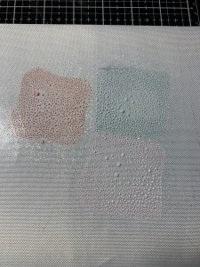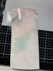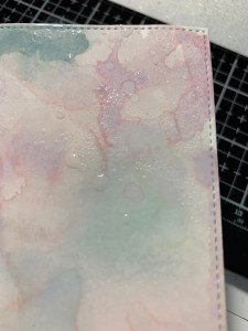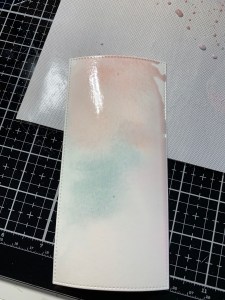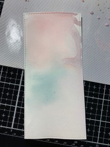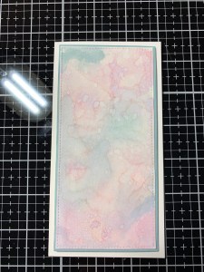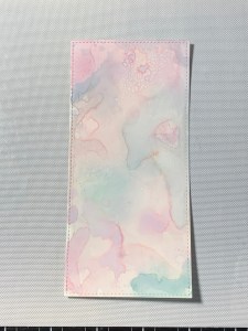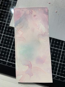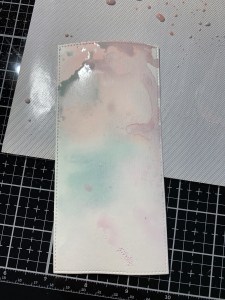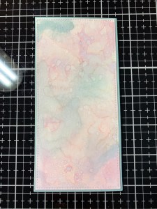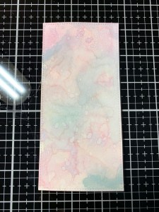 Taking my die cut panel, I press it into the ink colors then lift the panel to reveal the ink blend. To dry each layer after pressing into the ink I use my Craft Tool to dry the ink. I then press the panel back into the ink droplets for another layer and again, dry with my Craft Tool. To bring in a lighter shade of pink I add Tattered Rose Distress Oxide Ink to the mat and spritz with water. I continue pressing my panel onto the ink colors, drying in between until I am satisfied with the look. *To avoid muddy colors and to get those defined color droplets it is important to dry each ink layer. If colors muddy and combine on my mat, I clean the mat off and apply fresh colors and again spritz with water.