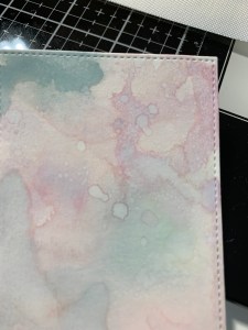 To start I take the largest stitched rectangle die from the Master Layouts 7 Die Set and cut out of Watercolor Cardstock, running them through my Big Shot Die Cut Machine. Next, press Victorian Velvet Distress Oxide Ink, Milled Lavender Distress Oxide Ink and Speckled Egg Distress Oxide Ink onto my silicone mat that comes with the Glass Media Mat. I then take my Distress Sprayer filled with clean water and spray over the ink colors spraying enough water to make the color bead up.