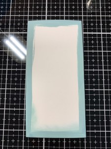Next, I take the largest layering rectangle die from the Master Layouts 7 Die Set and cut out of White Cardstock, running them through my Big Shot. To color coordinate with my ink smooshed panel I take my Speckled Egg Distress Oxide Ink Pad and run it across all four sides of my panel then dry it with my Craft Tool. Using Double Sided Adhesive Tape I adhere my two panels together. I now have a layered piece that matches the ink on my ink smooshed panel.
