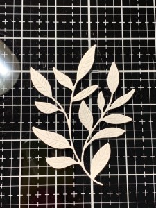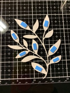 Taking the Privet Branch Die I cut out of White Cardstock three times, running them through my Big Shot. Using Liquid Glue I stack and glue the die cuts together. To help my die cut stand out more from the background I add Foam Squares (that I cut in half) to the back of most of the leaves. I remove the release papers then adhere to the center of my panel allowing some of the leaves to hang off a bit.