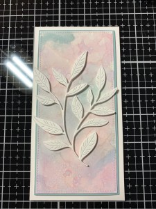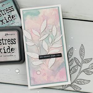 Today I have a mini slimline card featuring the Privet Branch die from Simon Says Stamp DIEcember release! I have created an ink smooshed background using some soft, muted Oxide Ink colors as a backdrop for this die. When oxide inks were first released the ink smooshing technique was most popular as these inks layer on top of one another for a beautiful effect. I forget how simple and fun ink smooshing can be and do not use it enough! The Privet Branch die has a beautiful, delicate design with etched details in the leaves. I knew I wanted to create something keeping the die cut piece white over and inked background. I was drawn to the soft, muted colors as I felt they would add to the delicate look of the die cut. Let’s get started!!