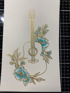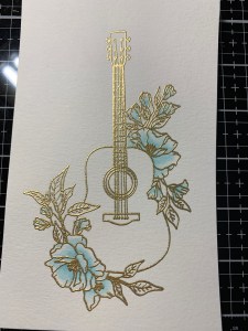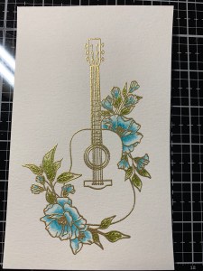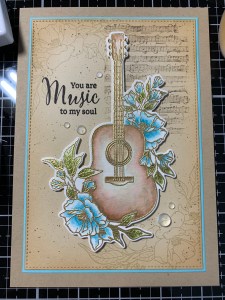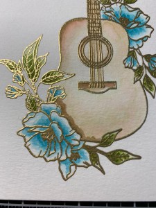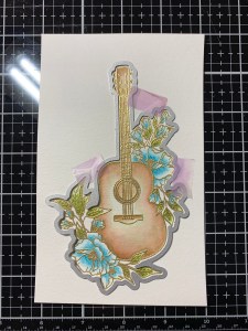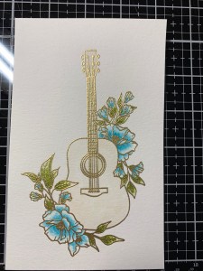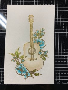 For the guitar I start out by adding a very light wash of Kraft Ink to the entire image using my Water Brush. I then add some Warm Cocoa Ink to the edges and blend the color out towards the center of the image. Again, I am starting out light adding layers and different shades of ink to build up the color.