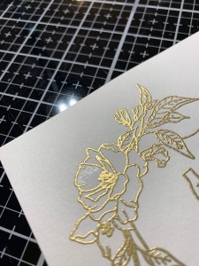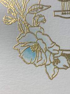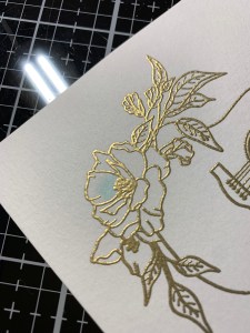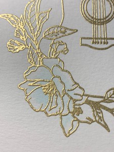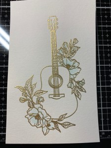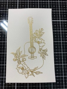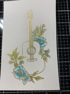 To start, I place a piece of Watercolor Cardstock into my MISTI Stamp Positioner and prep it with my Anti Static Powder Bag. I then choose an image from the Music To My Soul Stamp Set and stamp it onto the panel using Versamark Ink then add Gold Embossing Powder and heat set it with my Heat Tool. *Because the cardstock is textured, I ink up and stamp my image onto the panel two or three times to get a good crisp image before adding the embossing powder.