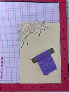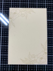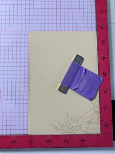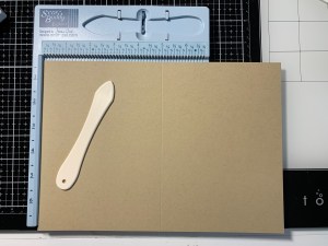 For my card base I place a 7″ x 10″ piece of Kraft Cardstock into my Scor Buddy and score it at 5″ creating a side folding card base. I then add Liquid Glue to the back of my panel and adhere it onto the card base.