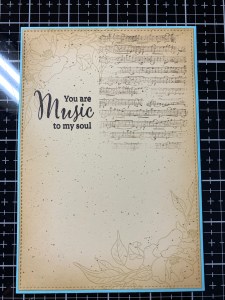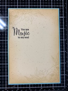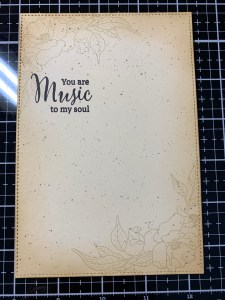 Placing the panel back into my MISTI, I line up a sentiment from the same Music To My Soul Stamp Set and stamp it using Amalgam Obsidian Black Ink. I then take a Blending Brush and lightly blend Warm Cocoa Ink around all four edges and corners of my panel. For some added texture I pick up some Charcoal Brown Ink with a small wet paintbrush and spatter it over the panel. *You will notice that a greeting in the finished card is not mentioned here. It wasn’t until my card was fully completed that I decided to add that greeting! It’s never too late to change things up, LOL