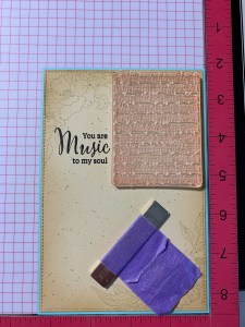 I now take the layering rectangle die from the Master Layouts 8 Die Set and cut out of Sea Glass Cardstock, running them through my Big Shot. Using Liquid Glue I adhere the two panels together. Thinking my background needs something more, I place the panel back into my MISTI and position another image from the Music To My Soul Stamp Set towards the top right corner. I then ink this image up with Charcoal Brown Ink, but before stamping I take my finger to pull off or lighten some of the ink around the edges and other areas of the stamp. I then stamp the image onto my panel. Removing some of the ink gives the image more of a tattered look that I feel blends into the background a bit more and makes it not as stark.