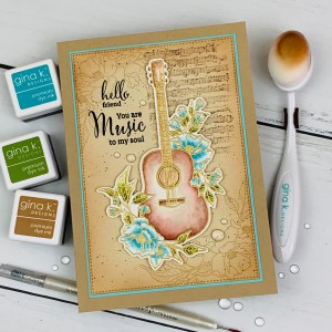 Welcome to Gina K. Designs’ brand new release!! Gina’s release is now live and you can find all of her new products by clicking HERE. Gina will be showcasing all of the new products during her live on both her YouTube channel and Facebook page starting at 7:00pm CST and as always, she will have a fun card project at the end. Can’t make the live or missed it? You can always watch the replay! Included in the new release is a brand new kit! Gina’s kits are always packed with so much product, and is such a tremendous value! Don’t forget when you spend $50.00 or more (before coupons, tax and shipping) you will receive free shipping… and when you spend $75.00 or more (before coupons, tax and shipping) you also will receive a free incentive stamp set! For today’s card I will be using the Music To My Soul stamp set to create a 5 x 7 card. This is a large 6 x 8 stamp set that includes beautiful images along with many sentiments and greetings that are perfect for the music loving people in your life! I chose to watercolor the large guitar image using inks from Gina K. for my focal image and also used a couple of other images from the set to accent my background. Because this is a large sized stamp I decided to go with a 5 x 7 card size to allow for some extra space to create my background. All of the stamps, inks, dies and cardstock I use on today’s card are from Gina K. Designs. Let’s get started!!