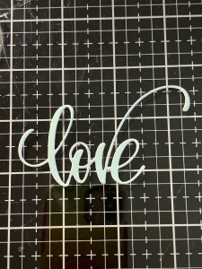 For a greeting I cut out of White Cardstock using the love die from the Love And Shadow Die Set, running them through my Big Shot. Leaving the die cut piece inside the cardstock, I take my Speckled Egg Distress Oxide ink pad and press it onto the die cut piece lightly dragging the pad until I have full coverage then remove the die cut from the cardstock. *Using the same color ink as I did with the folder really coordinates the look of colors. Because I added the ink pad directly to my die cut piece it created a much darker hue which helps the die cut to stand out from the background.