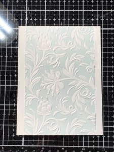 After inking up the folder I place a 4 1/4″ x 5 1/2″ piece of White Cardstock onto the un-inked side then close the folder onto the cardstock. Keeping the folder closed in my hand, I place it onto the platform then place a cutting plate on top and run it through my Big Shot Die Cut Machine. I then trim the sides down using my Guillotine Paper Trimmer making the panel 3 1/2″ x 5 1/2″. *Be sure to check the manual for using 3D folders with your die cut machine, these folders are thicker and require less plates. You can lightly mist the cardstock with water before placing into the folder to avoid cracking of the cardstock, I did not use any water with mine and had no problems.