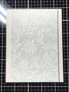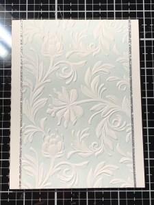 Using my Guillotine Paper Trimmer I cut two thin strips, about 1/16″ wide out of Silver Glitter Paper. I then run a fine line of Liquid Glue along both sides of my inked panel where it meets the card base then add the silver strips and press them along the edge, cutting off any overhang.