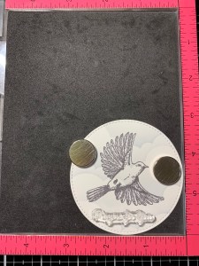 To stamp a sentiment, I place the circle die cut into my MISTI, holding it in place with the magnets. Taking a sentiment from the Fearless Flyers Stamp Set, I line it up under my stamped image then stamp the sentiment using Amalgam Obsidian Black Ink.