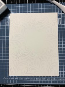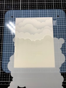 Using my Guillotine Paper Trimmer, I cut a 4 1/4″ x 5 1/2″ panel out of White Cardstock. I then place the panel onto my Make Art Stay-tion and line up my Cloudy Stencil over the top portion of the panel then secure it down using the magnets. Taking a Mini Blending Brush, I blend Soft Stone Ink over the edge of the stencil fading out the ink out onto the cardstock.