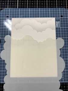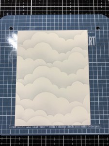 I clean the ink off my Cloudy Stencil and continue to rotate and blend the ink as I move down the panel until the panel is covered in clouds.