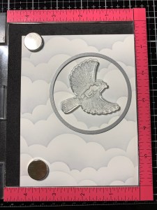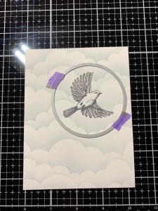 To stamp my image, I place the panel into my MISTI Stamp Positioner and take the stitched circle die from Master Layouts 8 Die Set and lay it over a portion of the cloud formation that I like as I will be using this same die to cut from the panel after my stamping. I then take an image from the Fearless Flyers Stamp Set and center it inside of the die, leaving some room at the bottom for a sentiment. I close the door of my MISTI to pick up the stamp then remove the die. I then ink up the stamp using Slate Ink and stamp the image onto the panel. I ended up stamping the image two times to get dark, crisp results.