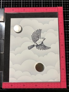 I take a damp cloth and wipe the ink off then rotate my Cloudy Stencil to use another edge and secure it in place with the magnets. *This stencil has four sides with different cloud formations, the stencil can also be flipped over to reverse the formations. Again, I take my Mini Blending Brush and blend Soft Stone Ink over the edge of the stencil and fade the ink out onto the cardstock.