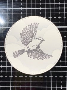 I now take the same stitched circle die from the Master Layouts 8 Die Set, center it over my stamped image and hold it in place with tape. I then run the panel through my Big Shot Die Cut Machine and I now have my image cut out with room to stamp a sentiment at the bottom.
