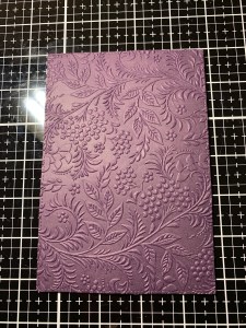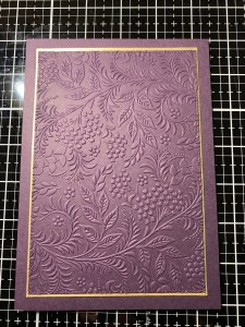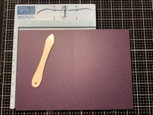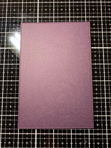 To create a card base, I place a 7″ x 10″ piece of Edible Eggplant Cardstock into my Scor Buddy and score it at 5″, creating a 5 x 7 side folding card base. Using Liquid Glue I adhere the embossed panel onto the card base. I then mount my pattern paper piece over the center of the card front, also using Liquid Glue.