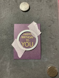 For my sentiment, I place a piece of Edible Eggplant Cardstock into my MISTI Stamp Positioner and prep it with my Anti Static Powder Bag. I then choose a sentiment from the It’s All You Mini Stamp Set and stamp it onto the cardstock using Versamark Ink. I then add Gold Embossing Powder and heat set it with my Heat Tool. Taking the small stitched circle die from the Master Layouts 7 Die Set I cut my sentiment out, running them through my Big Shot. *To remove the residual powder from my sentiment, I take a soft dry cloth and gently buff the cardstock.