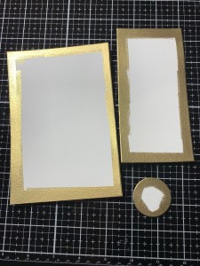 For my last layering piece, I take the small layering circle die from the Master Layouts 7 Die Set and cut out of White Cardstock, running them through my Big Shot. To add a gold edge to all of my layering pieces, I drag my Versamark Ink Pad over all of the edges of the layering pieces then add Gold Embossing Powder and heat set with my Heat Tool. I now have the same gold from my sentiment on all of the edges of the layering pieces. Using Liquid Glue I mount my sentiment onto the layering circle die-cut. I then adhere the embossed panel and pattern paper to their coordinating layering pieces using Liquid Glue.