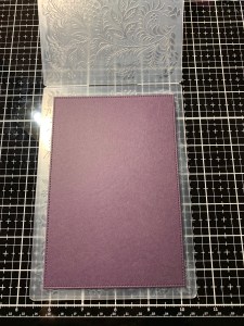 To start, I take the large stitched rectangle die from the Master Layouts 8 Die Set and cut out of Edible Eggplant Cardstock, running them through my Big Shot Die Cut Machine. To add texture and design, I place the panel into my Tapestry Embossing Folder and run them through my Big Shot. I then take the largest layering rectangle die from the same Master Layouts 8 Die Set and cut out of White Cardstock, running them through my Big Shot. *I will be die-cutting the layering pieces along the way, putting them aside to deal with later.