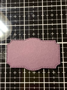 To create a backdrop for my sentiment, I take the label die from the Master Layouts 7 Die Set and cut out of Edible Eggplant Cardstock, running them through my Big Shot. Using Liquid Glue I mount the label onto the card front just above center then adhere my sentiment onto the label.