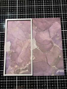 Next, I choose a design from the Ink Drops – Dusk Paper Pad and take the largest stitched rectangle die from the Master Layouts 7 Die Set to cut out of the paper, running them through my Big Shot. I also take the largest rectangle die from the same Master Layouts 7 Die Set and cut out of White Cardstock, running them through my Big Shot.