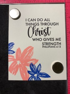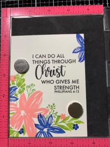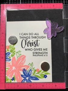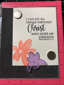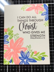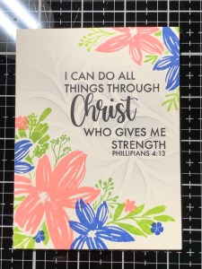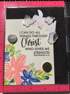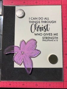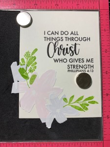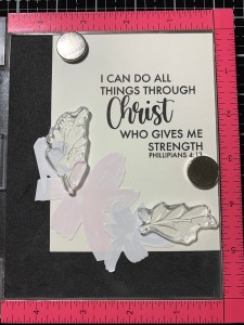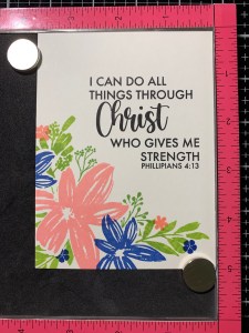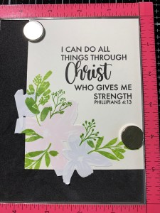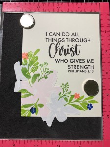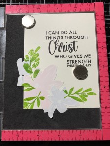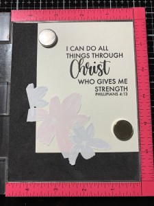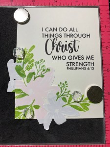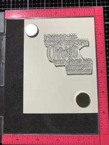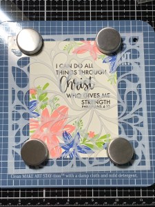 Once my stamping was complete, I thought the panel looked a little too stark and plain. To add some design and interest I placed the panel into my Make Art Stay-tion then placed my Water Droplets Stencil over the top and held everything in place with the magnets. Using my Blending Brush I blended some Soft Stone Ink a little heavier toward the center of the sentiment then faded the ink out. This stencil added a soft design to the plain center and tied everything together nicely. *When ink blending over a black stamped sentiment, be sure the ink is completely dry to avoid any smearing.