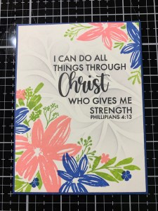 To add some color and design to my card, I take the large brushstroke floral from the Wonderful In Every Way Stamp Set and position it over the lower left corner of my panel and stamp it with Light Carnation Ink. I then take the smaller brushstroke stamp from the same Wonderful In Every Way Stamp Set and stamp the image on both sides of my first image using Blue Denim Ink.